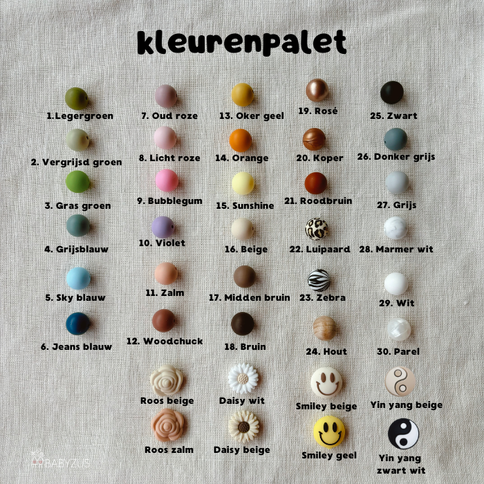 - Kies 3 kleuren & wij stellen jouw speenkoord met naam samen. We houden rekening met de volgorde van de gekozen kleuren, waarbij 1 meest gewenst, 2.. 3.. etc. We hebben inmiddels 20.000 ontwerp zelf speenkoorden mogen maken, dus hopelijk vertrouw je op ons! Heb je specifieke wensen mbt de volgorde van de kralen, dan kun je dit via het opmerkingenveld aan ons laten weten. Wij houden hier dan rekening mee.