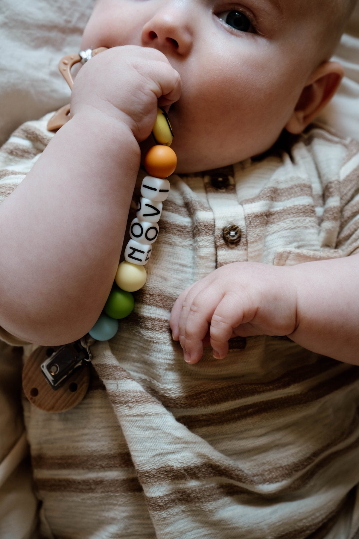 - Handgemaakt van de hoogste kwaliteit: Alle speenkoorden met naam worden handgemaakt in ons eigen atelier. Elk speenkoord met naam heeft de mooiste kwaliteit satijnkoord, houten of siliconen letterkralen en een houten clip waarmee je het speenkoord bevestigt.