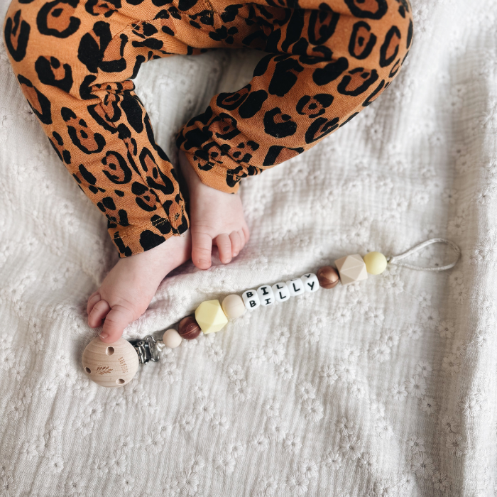 Never again a pacifier that falls to the floor and super hip with the outfit of the little one! Made more than 15,000 mothers and children happy with such a beautiful unique pacifier cord with name.